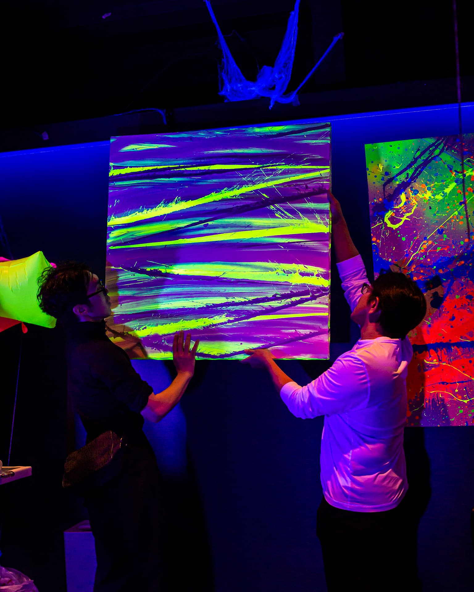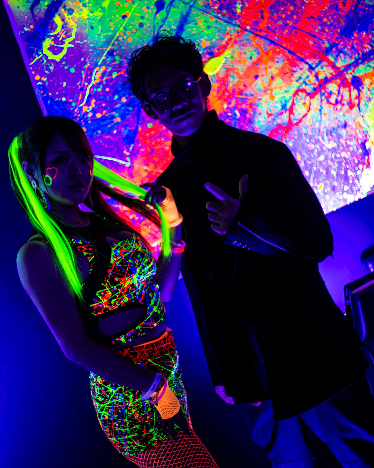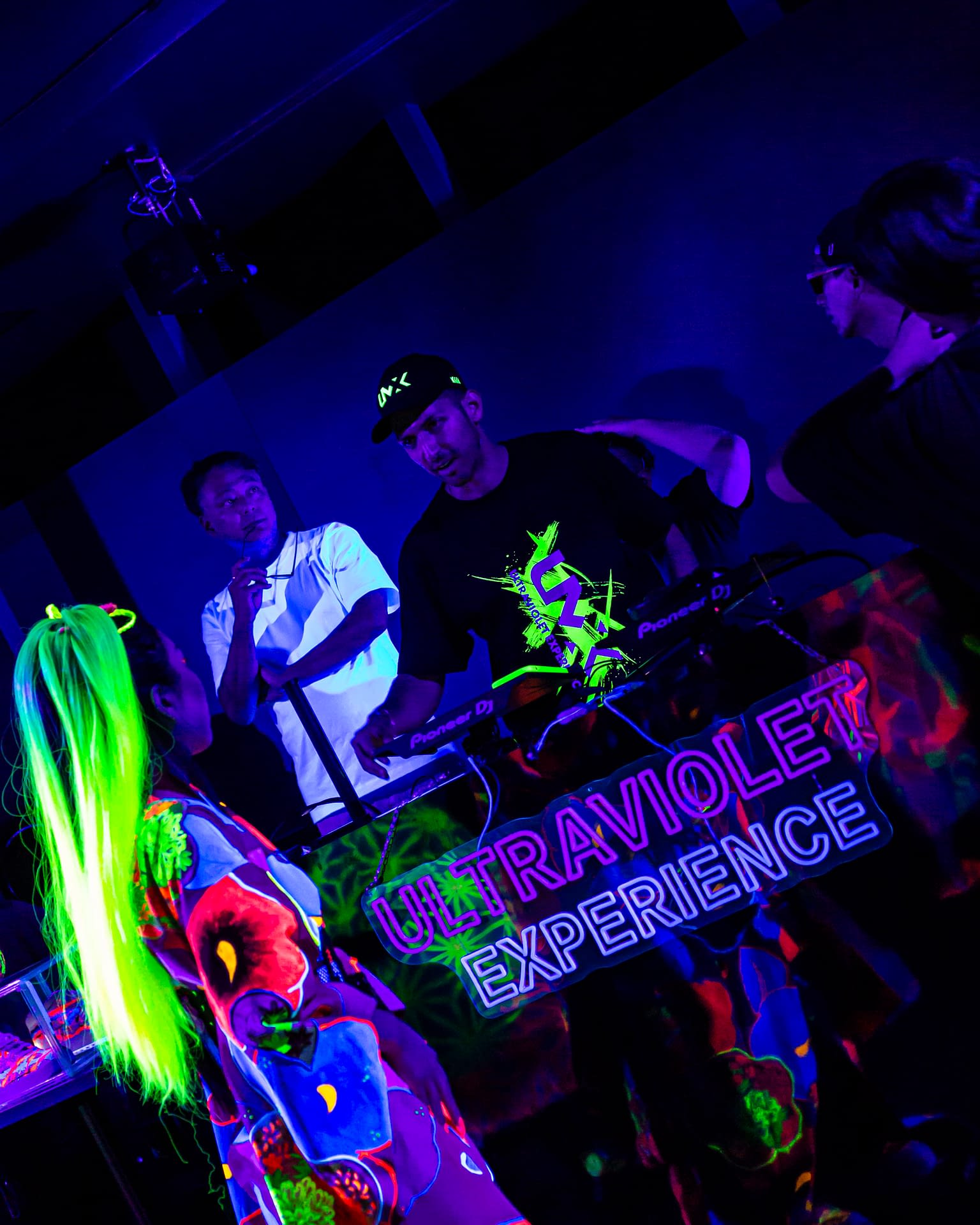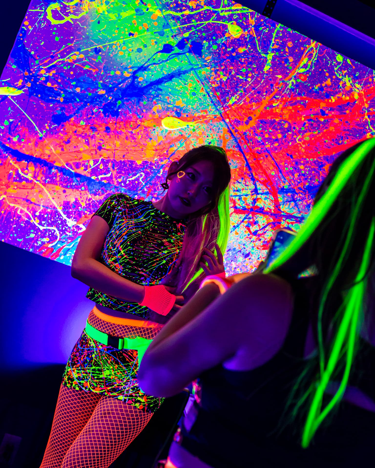 Each event takes place under UV-reactive blacklight, where neon colors like pink, green, and yellow come alive, glowing with energy and transforming the space into a living artwork.