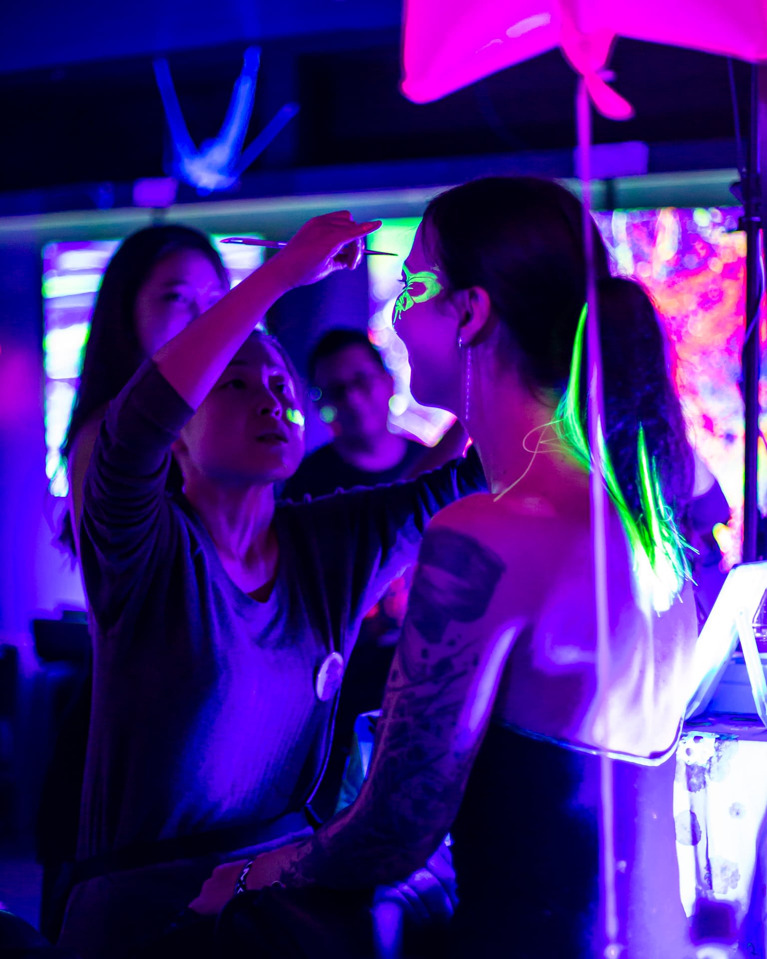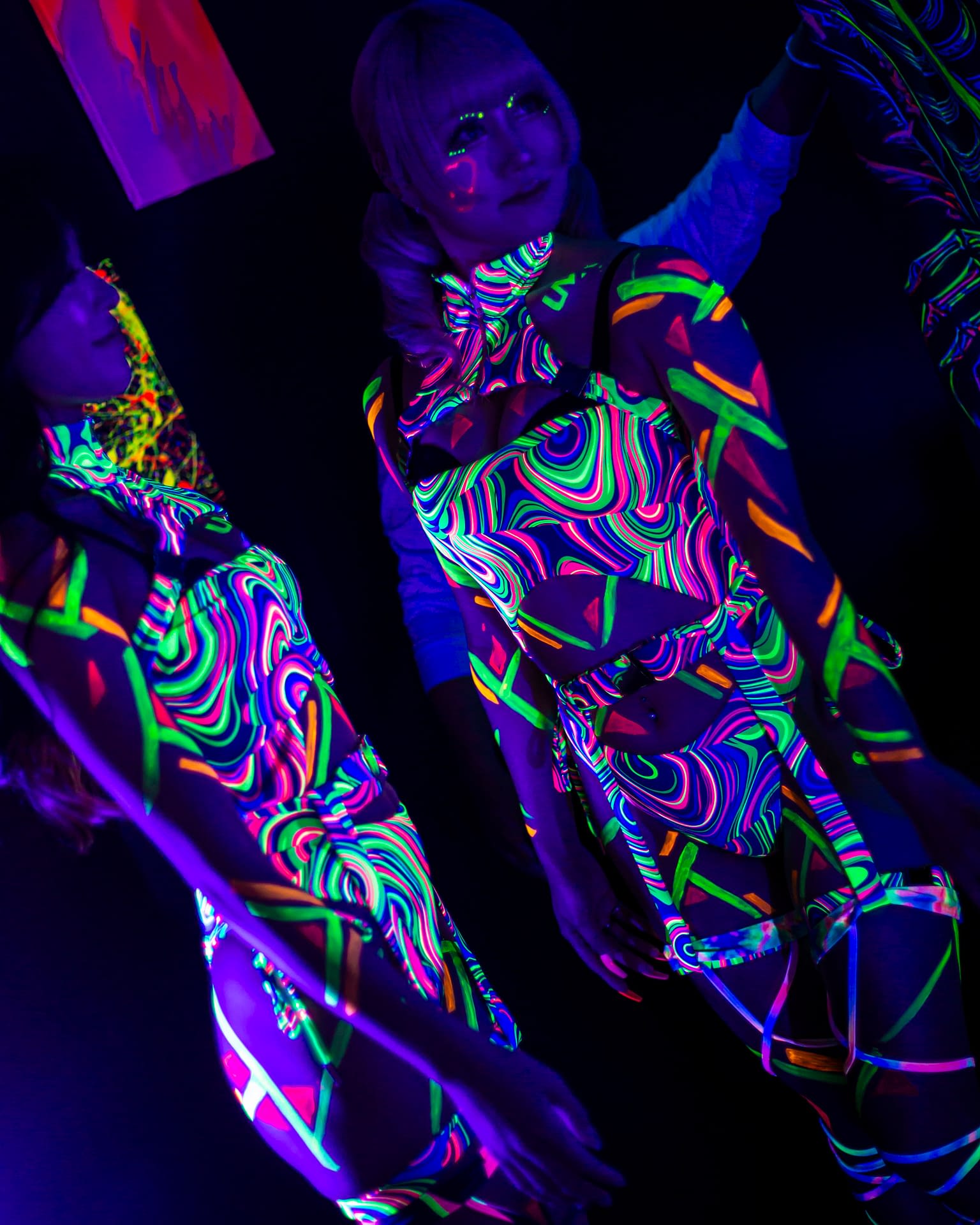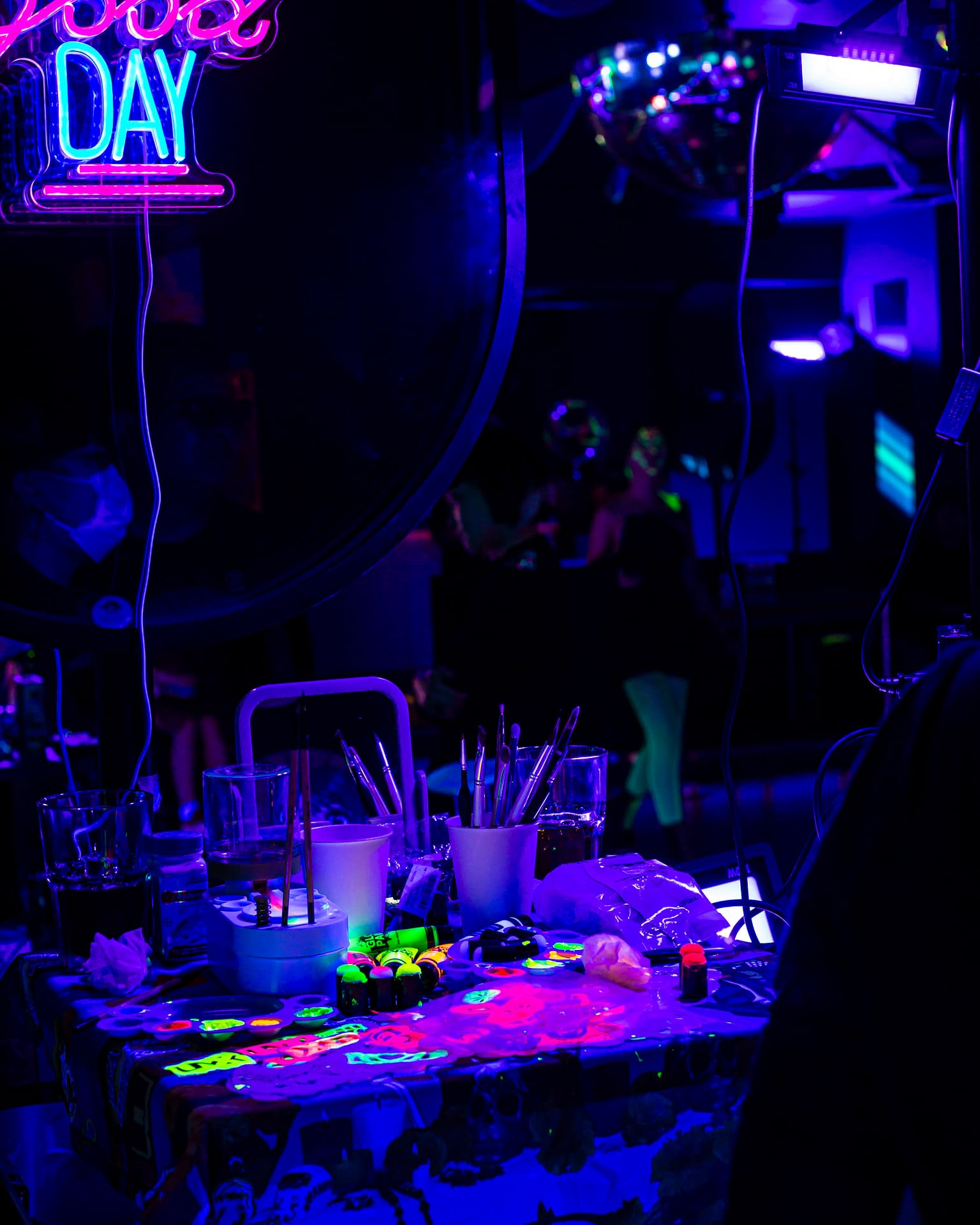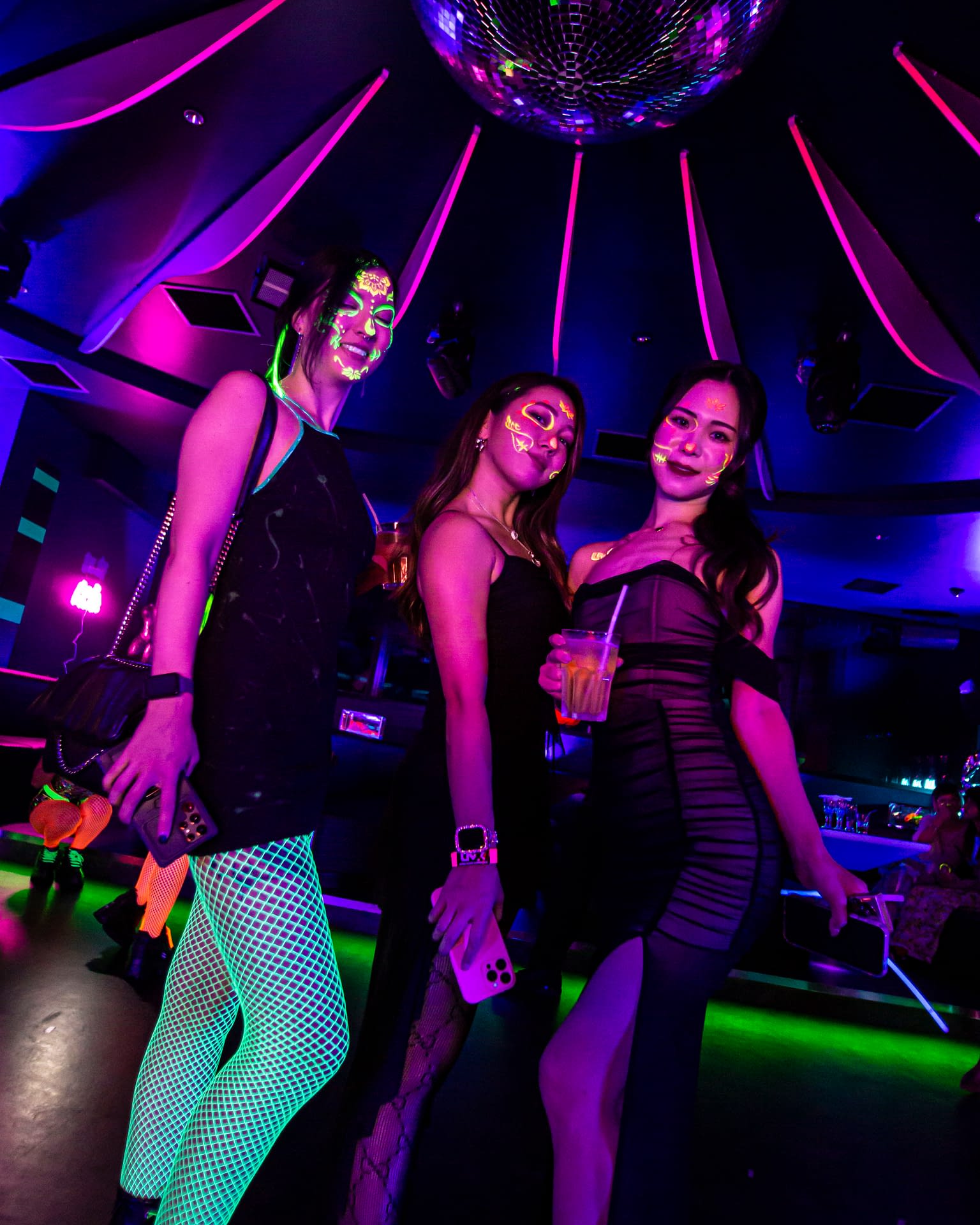 Each event takes place under UV-reactive blacklight, where neon colors like pink, green, and yellow come alive, glowing with energy and transforming the space into a living artwork.